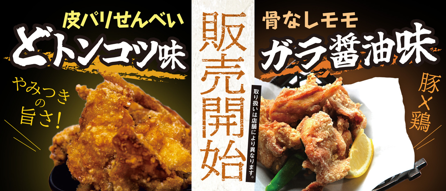 | 2025年5月12日 | 「皮パリせんべい/どトンコツ味」と「骨なしモモからあげ/ガラ醤油味」の販売を開始いたしました!!ぜひご賞味ください!