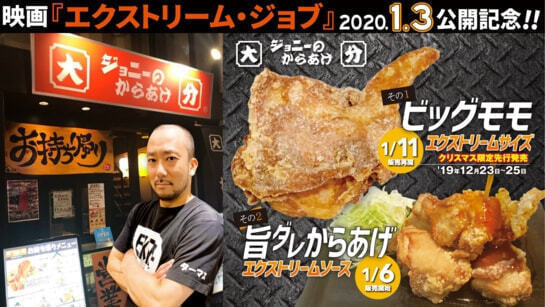 | 2019年12月17日 | 映画公開記念チキン発売 🍗 その①ビッグモモ:エクストリームサイズ その②旨ダレからあげ:エクストリームソース \\㊗//映画公開記念\\㊗//『#エクスト リームジョブ』 ムビチケカードプレゼント!! 応募は簡単▽ ☑@johnnyskaraageをフォローして、 ☑この投稿をRTするだけ! 20組40名様に当たる💥