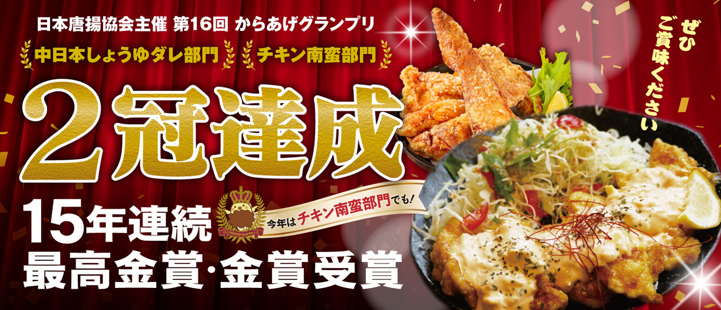 | 2025年4月9日 | 皆様の応援により「2冠達成!!」日本唐揚協会主催:2025年度 第16回からあげグランプリにて、今年はチキン南蛮部門で金賞に選ばれ、15年連続最高金賞・金賞を受賞しました!