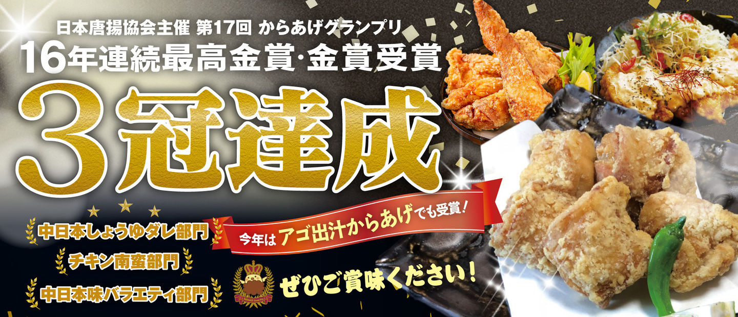 | 2026年4月10日 | 皆様の応援により「3冠達成!!」日本唐揚協会主催:2026年度 第17回からあげグランプリにて、今年は中日本味バラエティ部門にて「アゴ旨 出汁からあげ」が金賞に選ばれ、16年連続最高金賞・金賞を受賞しました!