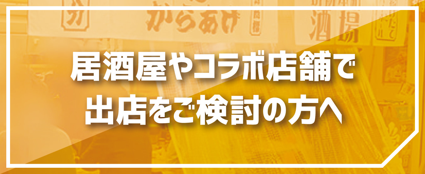 新規・既存問わず、あらゆる飲食事業とコラボレーション(Wネーム)店舗を出店しております。これまでには焼鳥・串カツ・ラーメン・カレー・ピザ・惣菜・カラオケ・お弁当・魚料理店 等とのコラボ出店を行なってまいりました。
