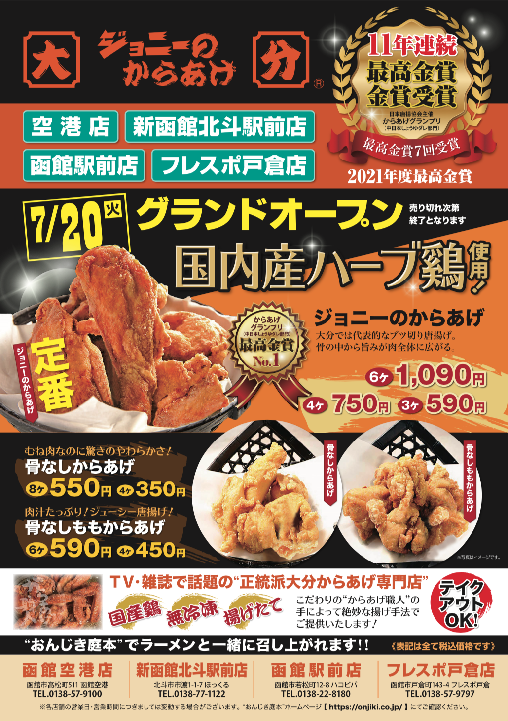 2021年7月20日より、ジョニーのからあげが北海道函館市内4店舗にてご購入いただけます。